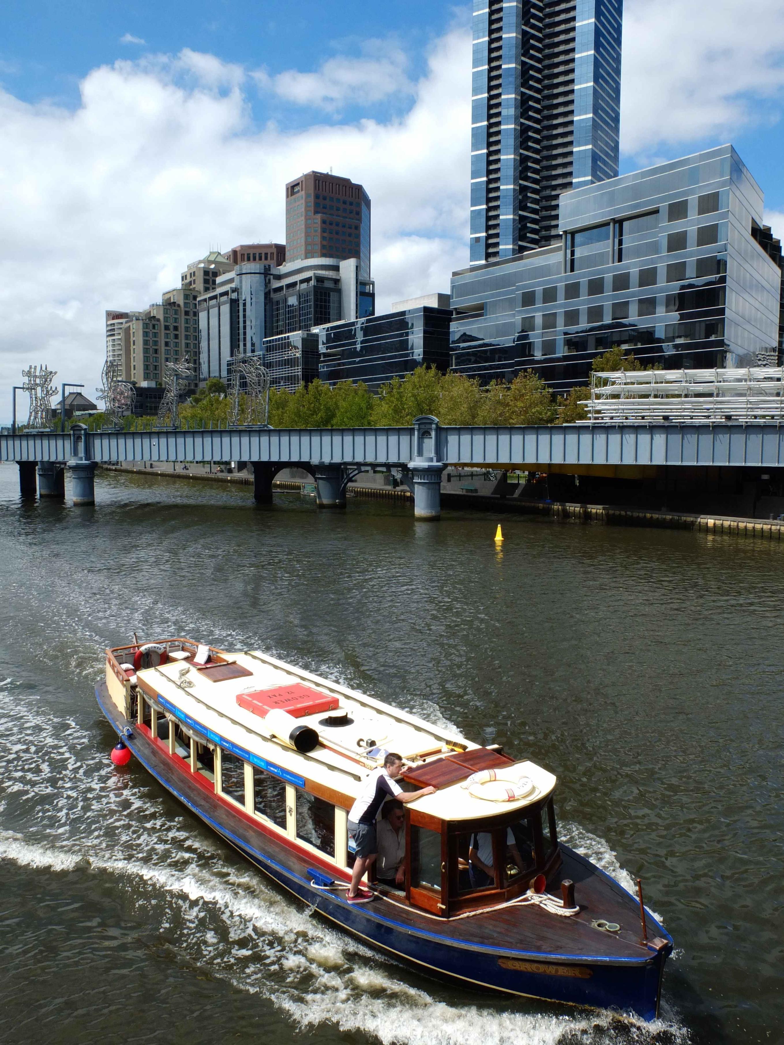 The prettiest way to tour the Lower Yarra is aboard the restored wooden boats of Classic Steamboat Cruises. Alas no longer driven by steam, but the quiet motor doesn't intrude on the peace of the water or the recorded tour narration. Thirty and sixty minute journeys are available, departing from Southgate landing.